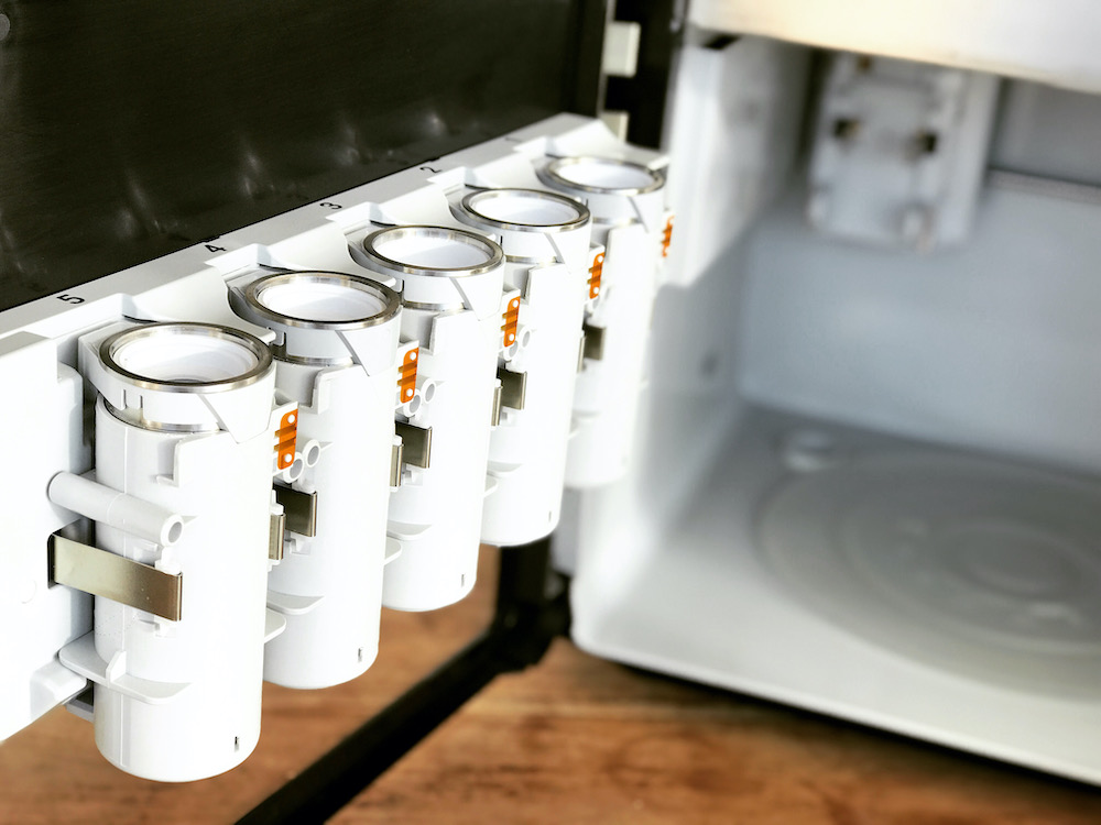 Foodini has room for up to 5 capsules holders that will automatically exchange as needed. They are numbered from left to right as 5-4-3-2-1. (Image is with the door open):