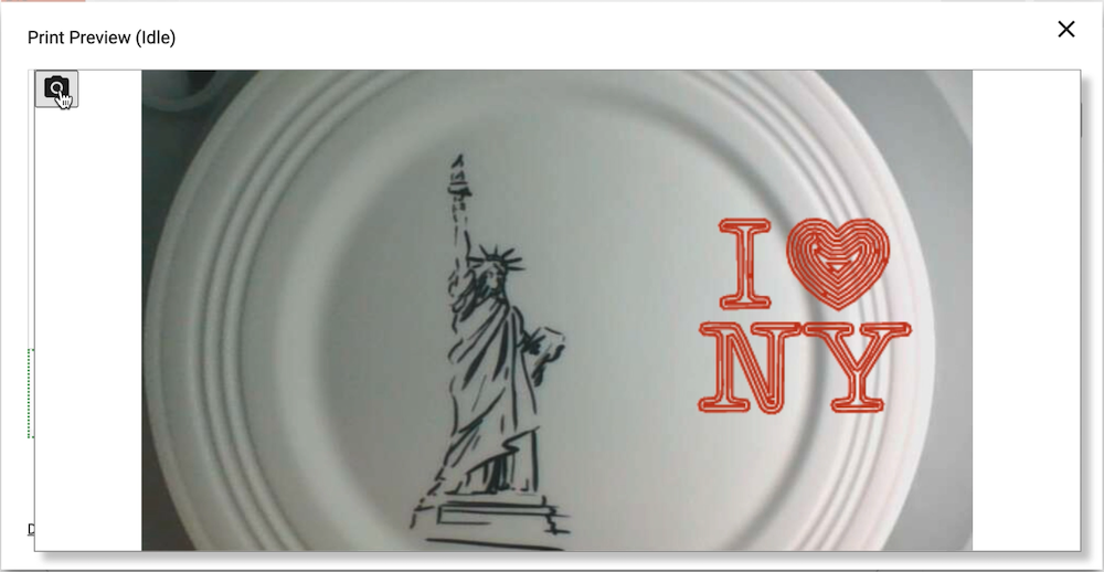 You can tap the image of the dish once to see a larger view. Tap the camera icon on the top left to activate the camera. Tap the camera icon again to toggle off the camera. Tap anywhere on the large image of the dish to go back to the full print preview screen.